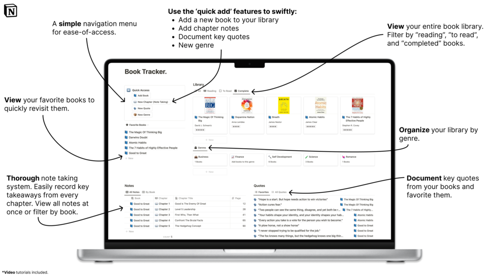 Elevate your reading experience with this comprehensive Book Tracker. Designed for bibliophiles, this template helps you manage your library, reading progress, notes, and favorite quotes in one centralized place.