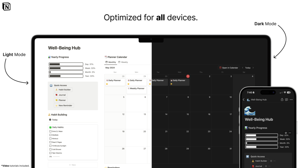 Designed for those who seek balance, productivity, and inner peace, my "Well-being Hub" is more than a templateโit's a companion on your journey to well-being. Elevate your daily rituals, achieve your aspirations, and engage in profound self-reflection.